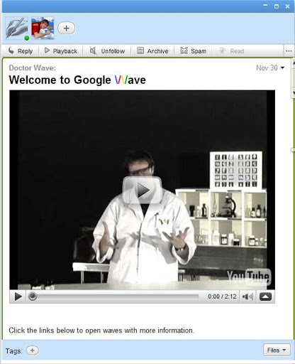 Сверху расположен список людей (назовем их участниками), которые могут работать с этой волной (в данном случае это ваш покорный слуга и экспрессивный человек в белом халате Doctor Wave, который рассказывает нам про основы Волны). Эти люди способны творить с волной все, что угодно: редактировать содержимое, добавлять новых участников, изменять теги волны и т. д.