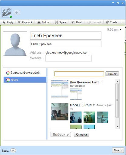 Поначалу я заметил странность: мои имя и фамилия, написанные кириллицей, отображались в качестве знаков вопроса. Однако, как только я ввел их заново и сохранил изменения, все стало как положено :-). Кроме того, именно здесь видна хорошо проработанная интеграция Волны с другими продуктами. Я уже говорил про то, что для юзания Волны нужен почтовый ящик Гугла. Здесь мы видим еще одну ступень интеграции: когда я выбирал фотографию, мне предложили взять изображение из моего альбома Google Picasa (который я создал, чтобы захостить фотки с проводов Масела). Мелочь, а приятно :-).